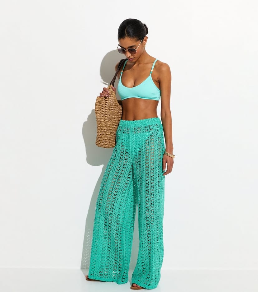 The New Look Turquoise Crochet Wide Leg Beach Trousers is made from crochet knit.