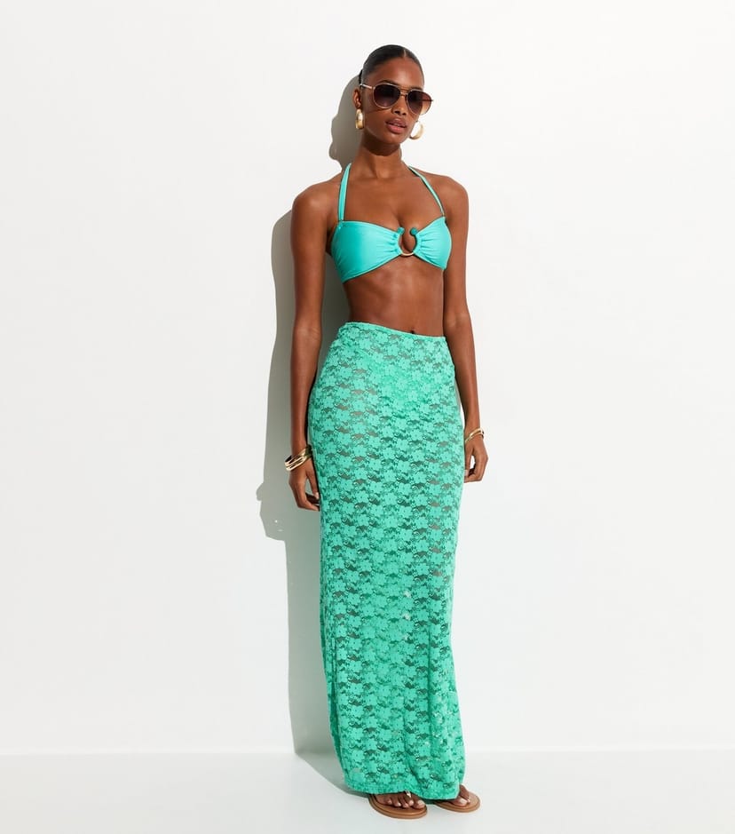 View New Look UK's returns policyThis turquoise lace maxi skirt from New Look is perfect for beach outings. The sheer lace fabric and high-rise waist offer a stylish and comfortable fit. Ideal for pairing with a matching bikini for a coordinated beach look.