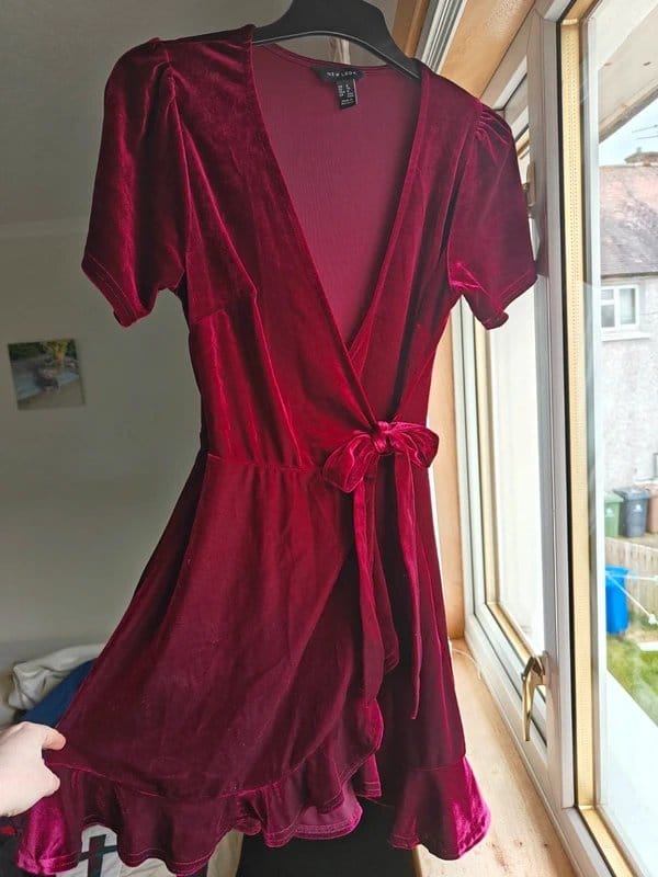 This burgundy velvet mini wrap dress from New Look features a wrap-around design with a V-neckline and short sleeves. The velvet fabric adds a touch of luxury, while the fringed hem adds a playful element. Perfect for a night out or a special occasion.