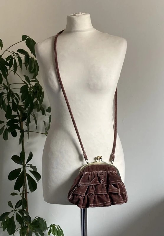 This vintage New Look clutch bag features a velvet texture with a long crossbody strap that folds away inside. The dusky mauve color adds a touch of elegance, perfect for any occasion.