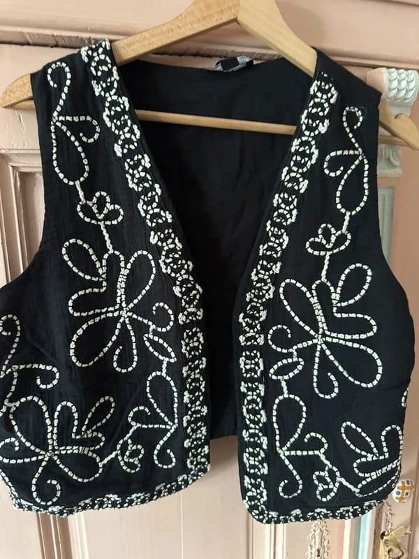 Stylish New Look waistcoat top in black with intricate white embroidered floral patterns. Perfect for adding a touch of elegance to any outfit.