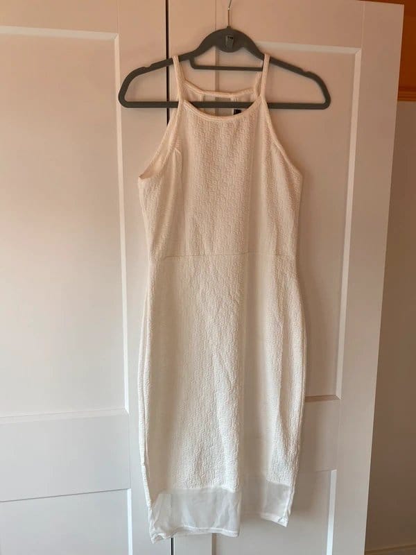 Stylish New Look bodycon dress in white with a delicate pattern and lace trim. Perfect for evening events or special occasions.