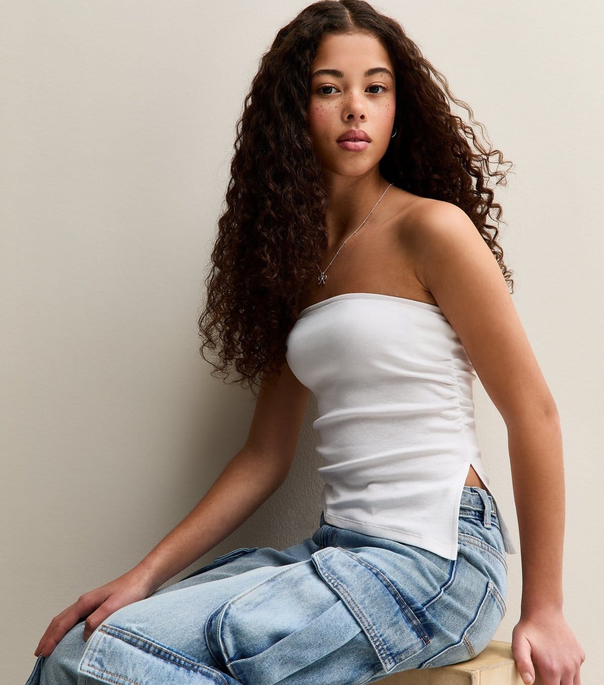 This white jersey bandeau top by New Look features an asymmetric design with ruching on the side. Ideal for versatile day-to-night styling.
