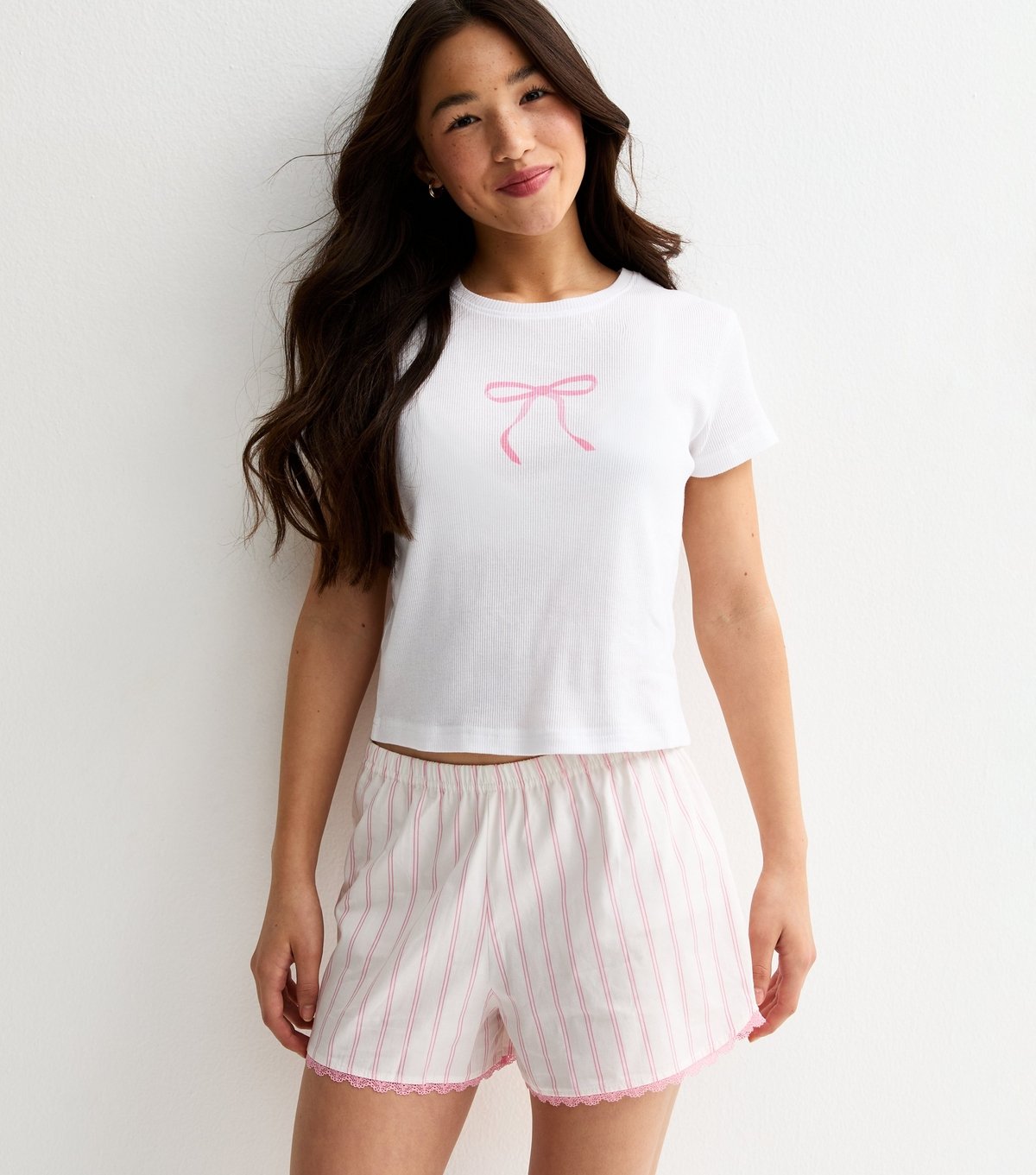 The New Look White Cotton Bow T-Shirt and Shorts Pyjama Set is ideal for casual, sleepwear, relaxed.