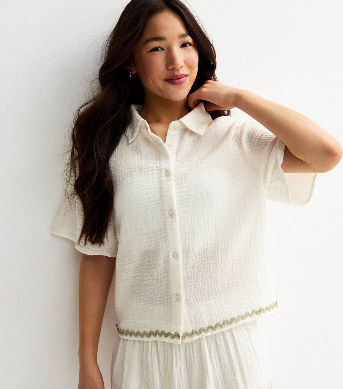 The New Look White Cotton Textured Shirt with Ric Rac Trim is available in sizes 10-11 YEARS, 12-13 YEARS, 14-15 YEARS, 9 YEARS.