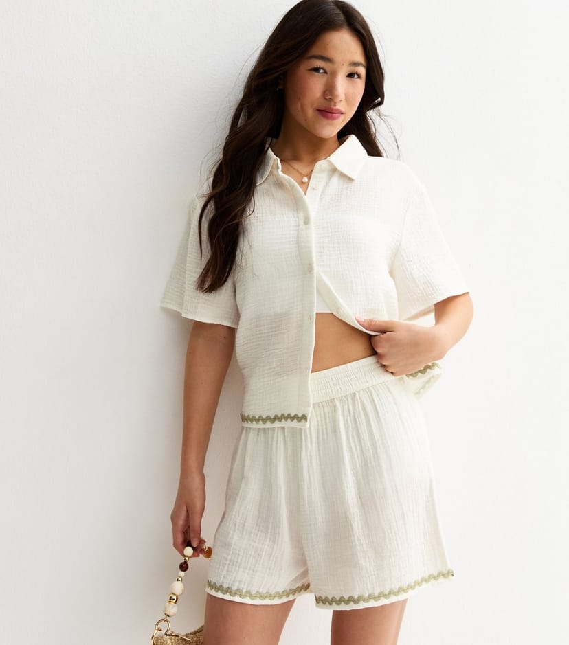 The New Look White Ric Rac Trim Shorts for Girls is made from crinkle texture.