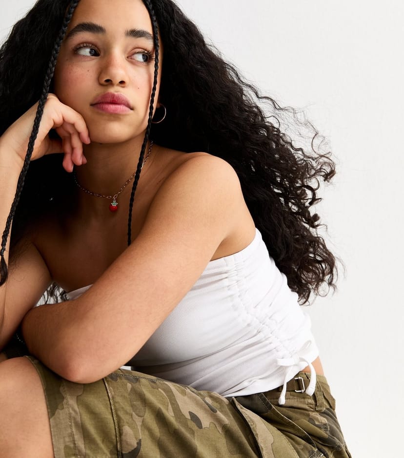The New Look White Ruched Side Tie Bandeau Top is available in sizes 10-11 years, 12-13 years, 14-15 years, 9 years.