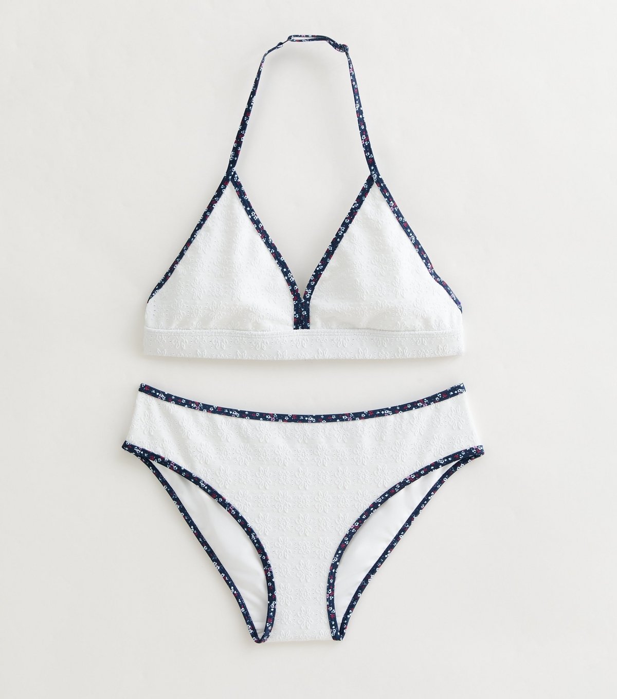 This white textured floral bikini set from New Look features a contrast trim in a ditsy print. Ideal for swims and light splashes, it's a summer essential.