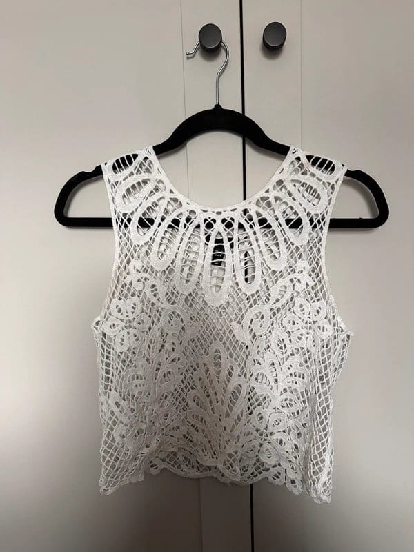 Delicate white crochet crop top with intricate lace patterns. Perfect for a casual summer look.