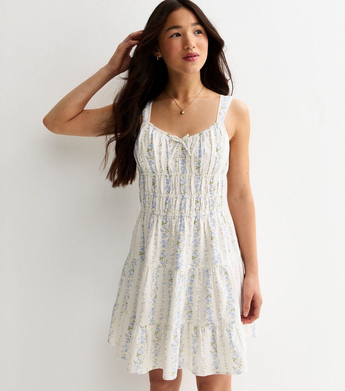 The New Look White and Blue Floral Ruched Mini Dress is available in sizes 10 YEARS, 11 YEARS, 12 YEARS, 13 YEARS, 14 YEARS, 15 YEARS, 9 YEARS.