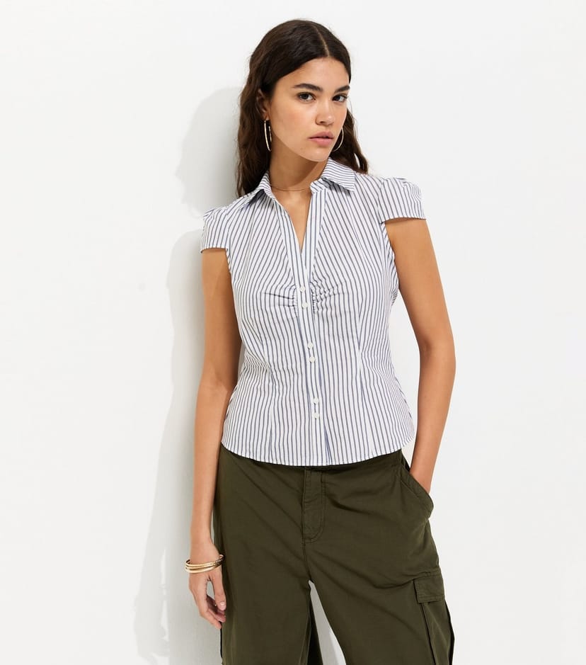 Chic blue and white striped cotton fitted shirt with double-spaced buttons and cap sleeves. Perfect for a casual yet stylish look.