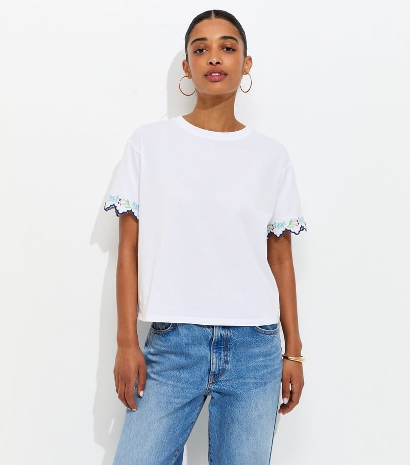 The New Look White Embroidered Sleeve Boxy T-Shirt is available in sizes 10, 12, 14, 16, 18, 20, 22, 6, 8.