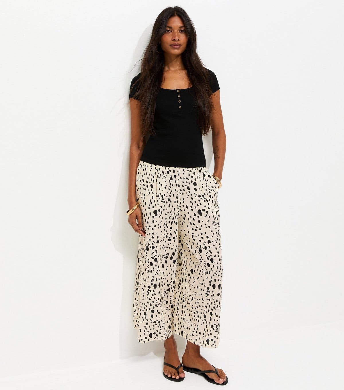 The New Look White Spot Print Cropped Wide Leg Trousers is available in sizes 10, 12, 14, 16, 18, 20, 22, 6, 8.