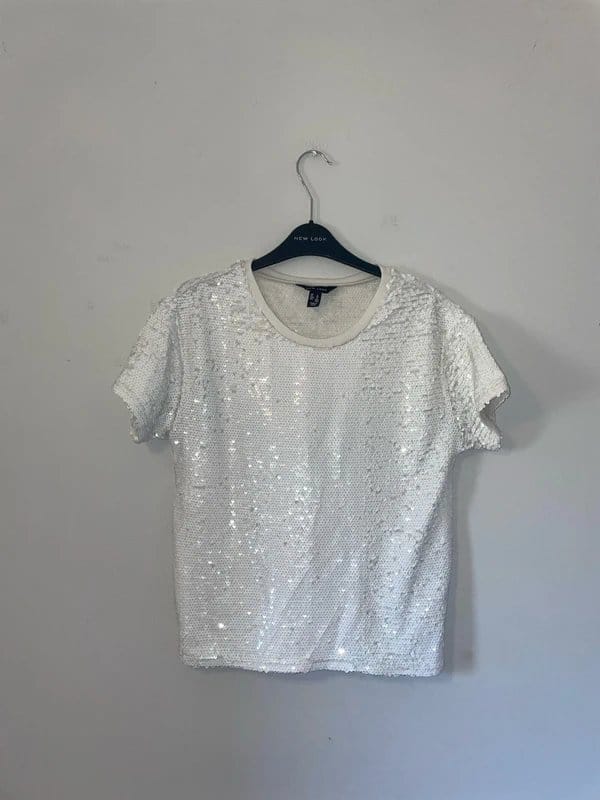 This white sequin embellished short sleeved top from New Look is perfect for a disco party. The sparkle and shine of the sequins make it a standout piece for any occasion.
