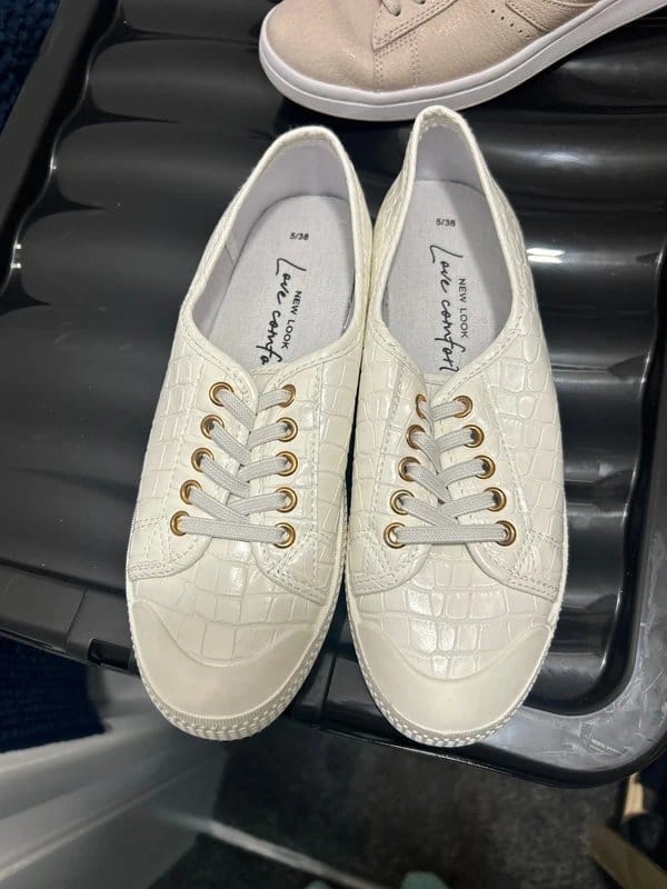 White Croc-Effect Lace Shoes by New Look. Crafted from croc-effect material, these shoes feature a lace design and gold lace tips. Perfect for adding a touch of elegance to any outfit.
