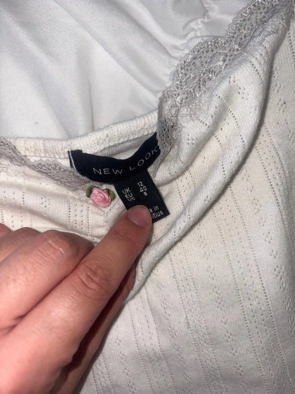 View Vinted's returns policyThis New Look top features a white lace trim around the neckline and sleeves. Made from soft cotton, it offers a relaxed fit and is perfect for casual wear.