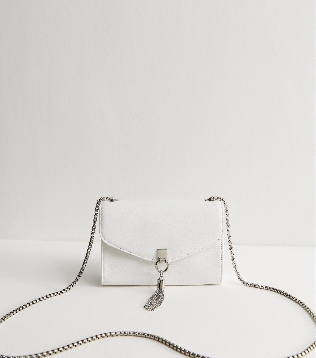Stylish white faux leather crossbody bag from New Look featuring a snake embossed texture and a chain strap. Ideal for a glam look, this bag can be worn on the shoulder or across the body for hands-free convenience. Certified vegan by The Vegan Society.