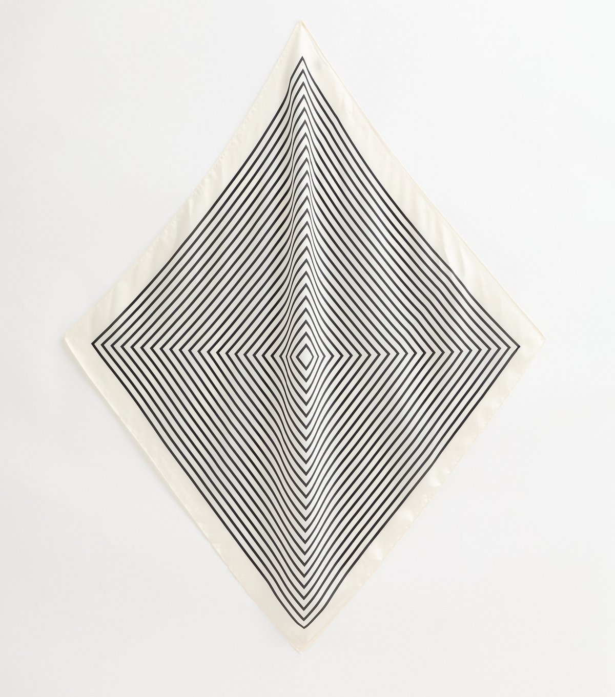 Versatile headscarf in white and black geometric stripes. A casual styling staple for any outfit. Perfect for adding a touch of pattern to your look.