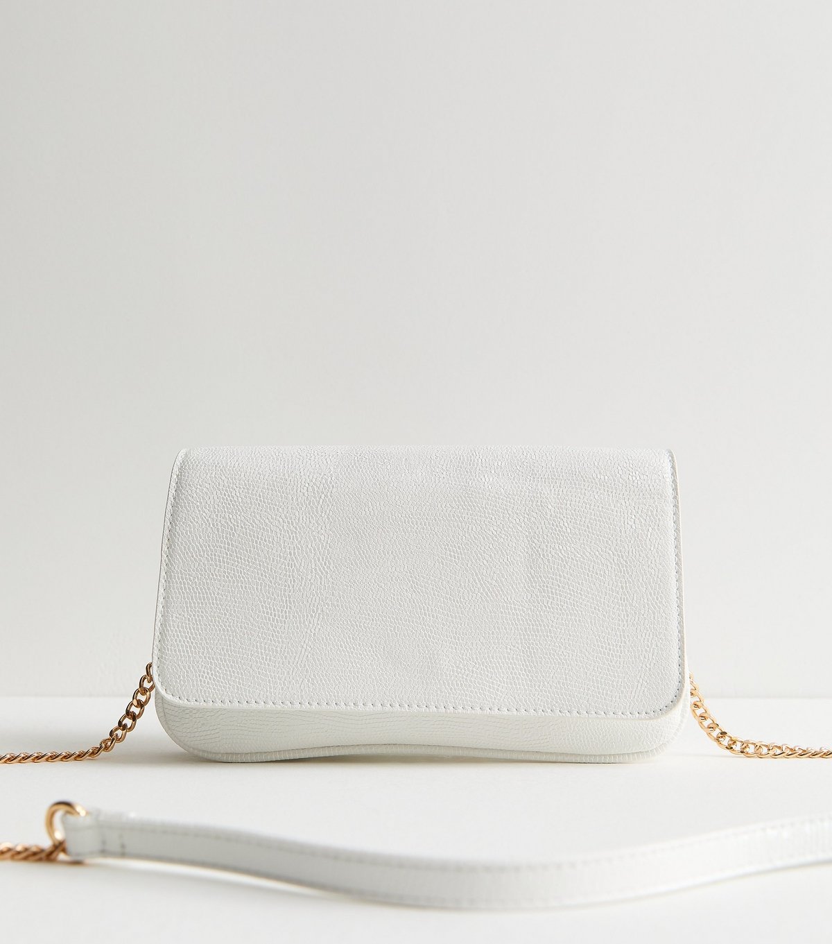 This white shimmer clutch bag from New Look is crafted from faux leather with a shimmery finish. Its minimalist design and chic gold chain make it a versatile accessory. Ideal for evening events or casual outings.