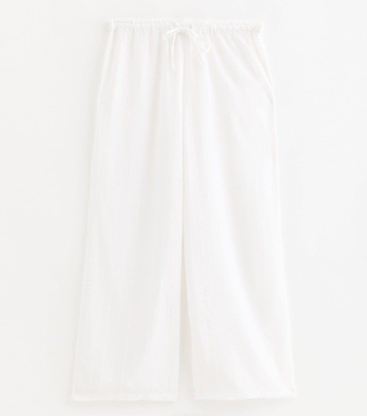 Lightweight woven striped trousers in white. Designed for a relaxed fit, these wide-leg trousers are perfect for casual outings or lounging by the waves. A simple staple for the summer months.