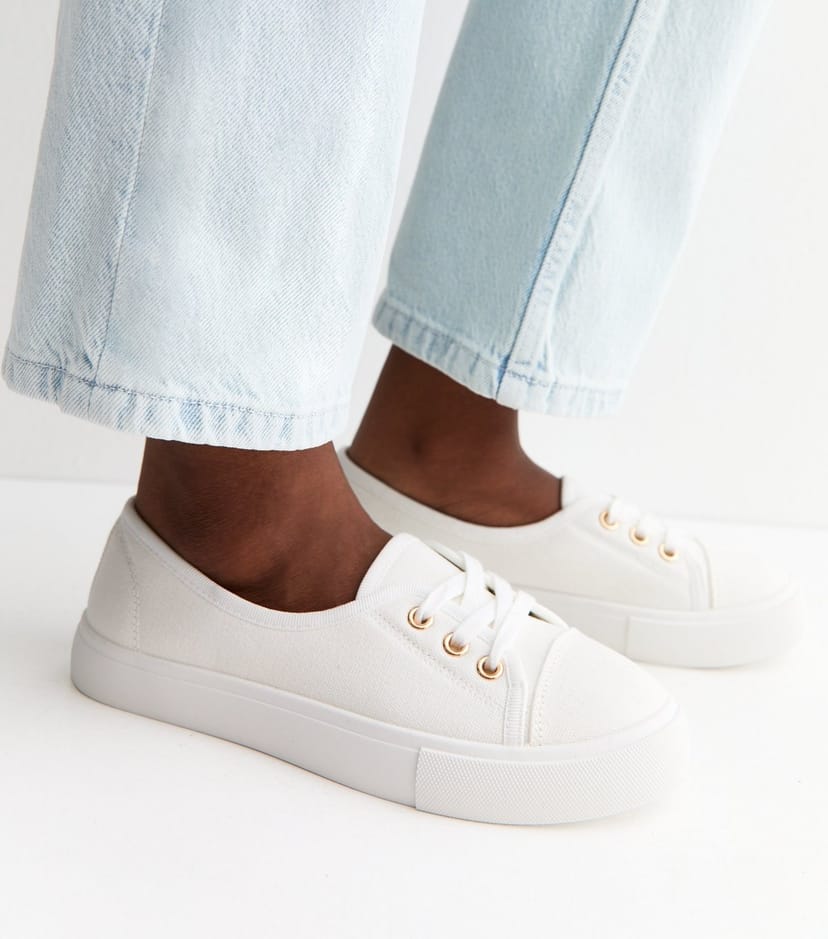 The New Look White Canvas Half Lace-Up Trainers is available in sizes 4, 5, 6, 7, 8, 9.