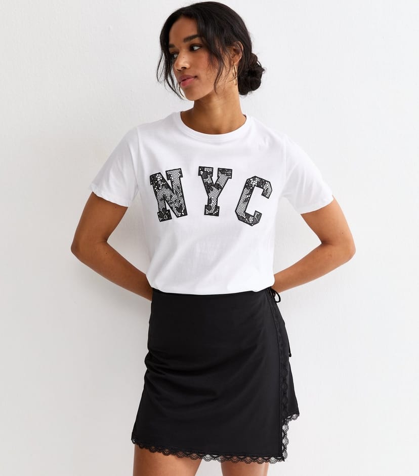 The New Look White Cotton Lace NYC Logo T-Shirt is ideal for casual, everyday.