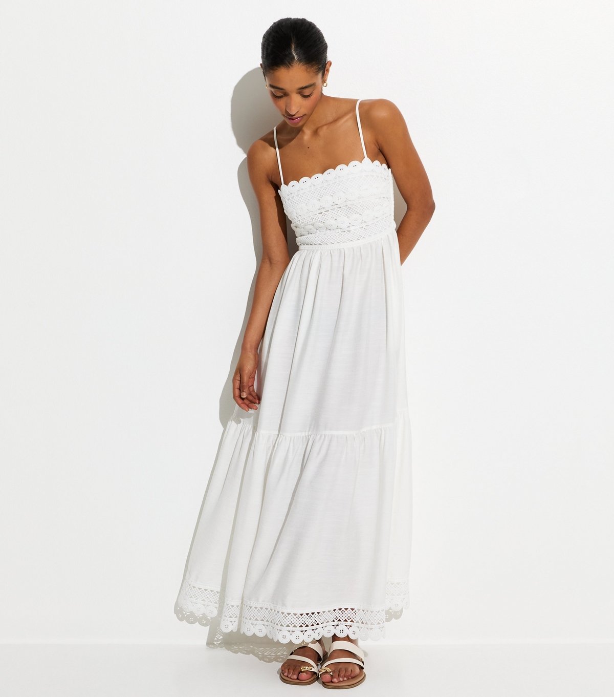Flowy white maxi dress with a shift fit and crocheted bodice. Ideal for beach days and outdoor parties.