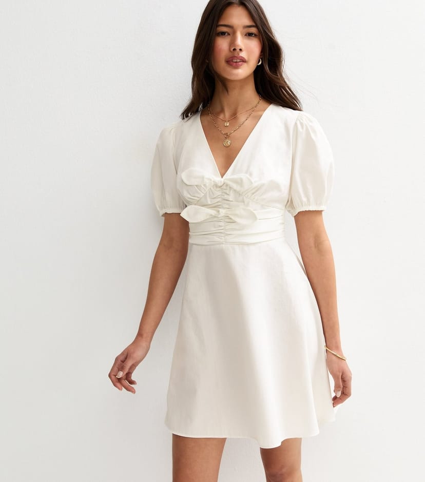 View New Look UK's returns policyCharming white mini dress from New Look featuring playful puff sleeves and decorative bows. Made from poplin fabric, it's perfect for warm-weather outings and holidays.