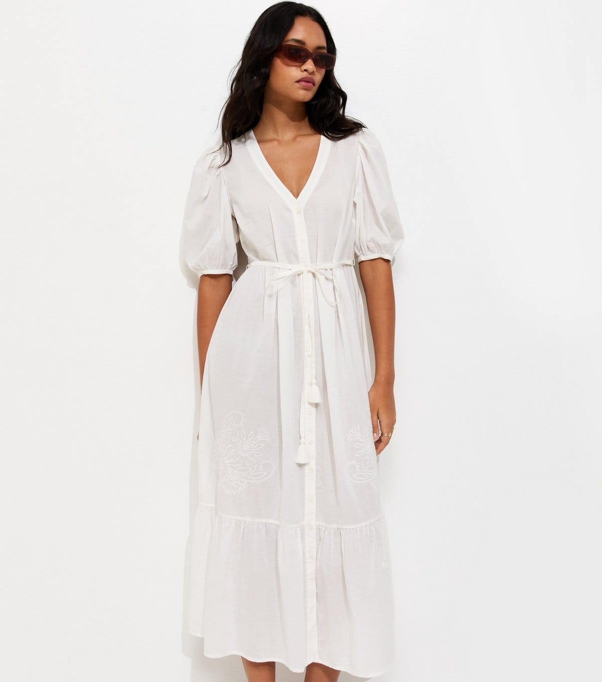 The New Look White Embroidered V Neck Midi Dress is available in sizes 10, 12, 14, 16, 18, 6, 8.