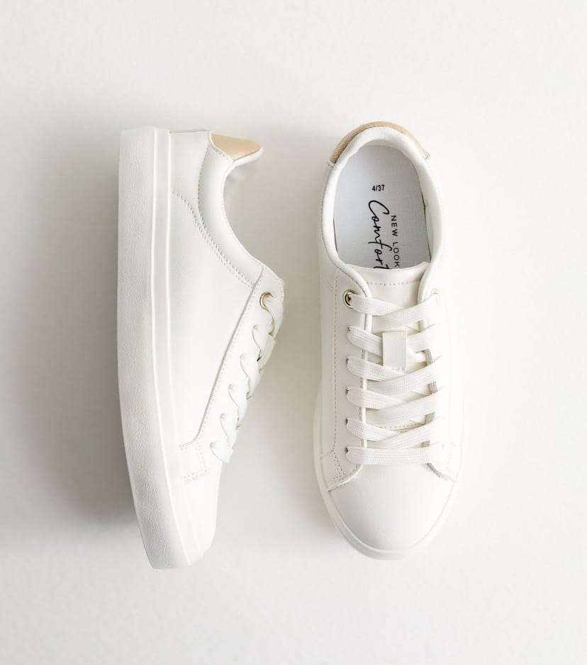The New Look White Faux Leather Trainers is available in sizes 7, 8, 9.