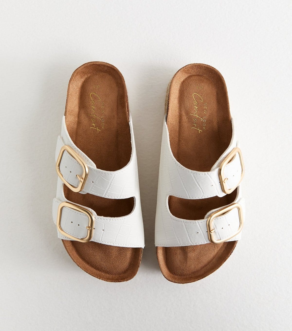The New Look White Faux Leather Double Buckled Sandals is available in sizes 3, 4, 5, 6, 7, 8, 9.