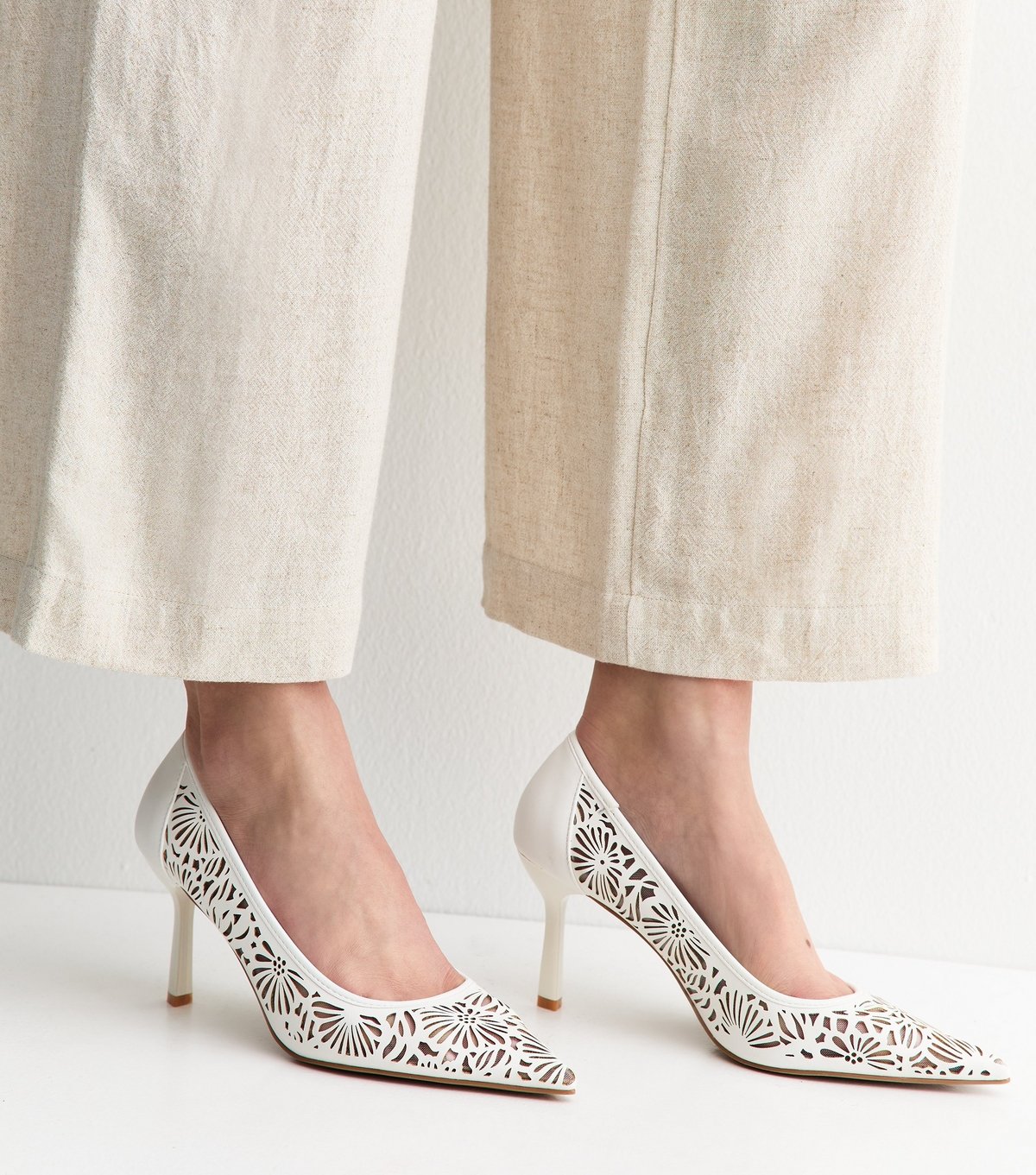 Chic white faux leather court shoes with floral laser cut-outs and a slender heel. Ideal for summer parties and special occasions.