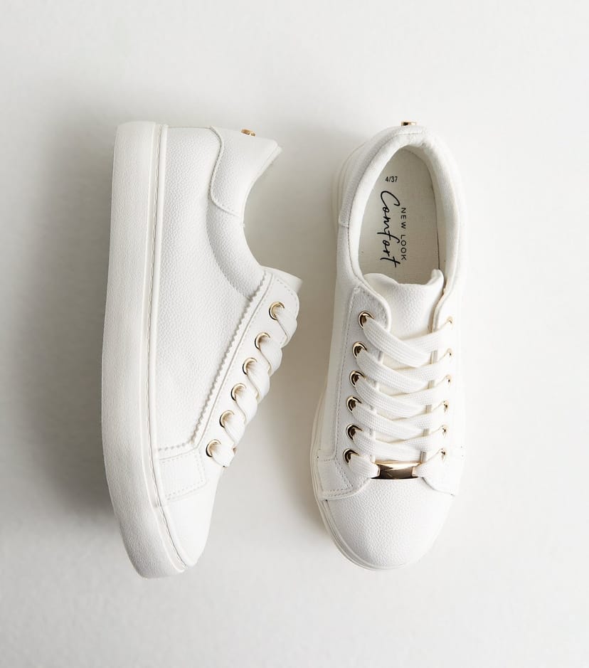 The New Look White Grained Faux Leather Lace-Up Trainers is available in sizes 3, 4, 5, 6, 7, 8, 9.