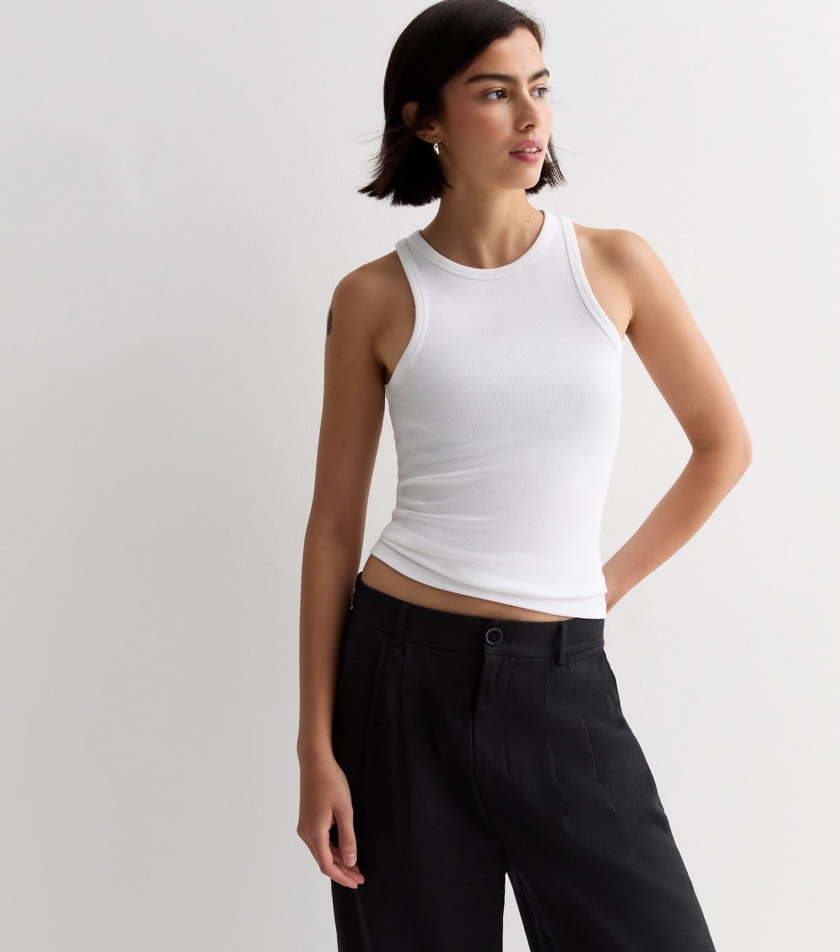 View New Look UK's returns policyThis white ribbed racer vest from New Look is a versatile wardrobe staple. Made from lightweight stretch cotton, it features a high round neckline and sleeveless design with thick shoulder straps. The racer back and pipe trim add a stylish touch.