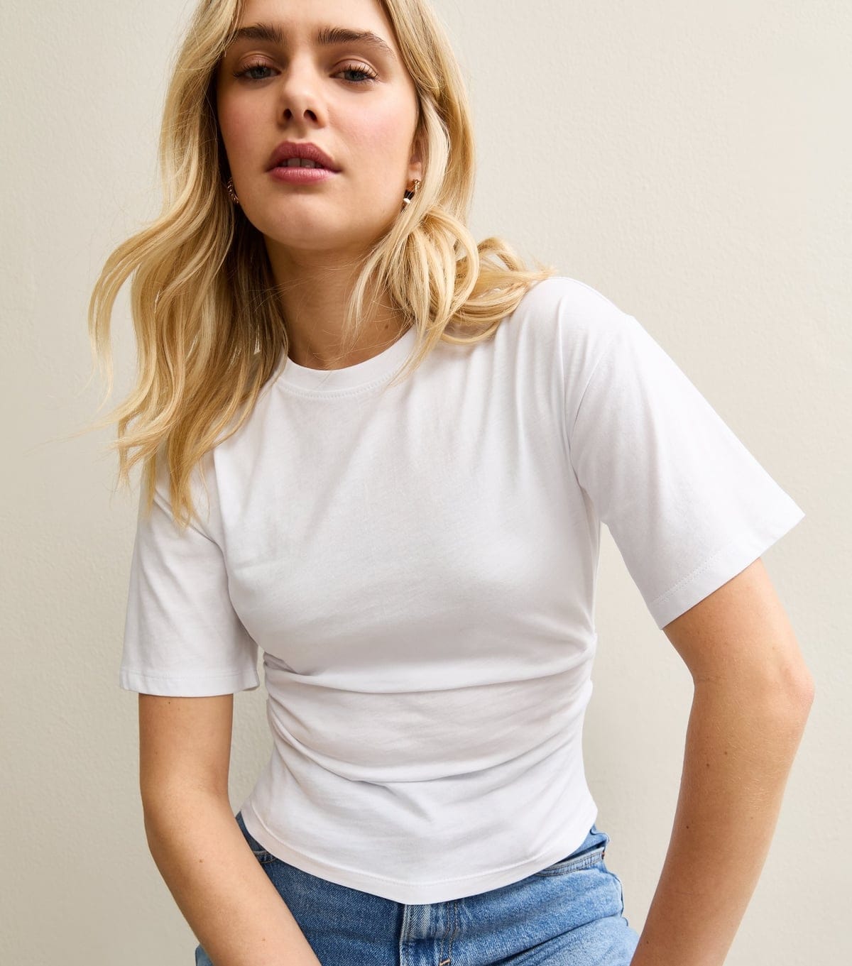 The New Look White Ruched Waist Crew Neck T-Shirt is ideal for casual, everyday.