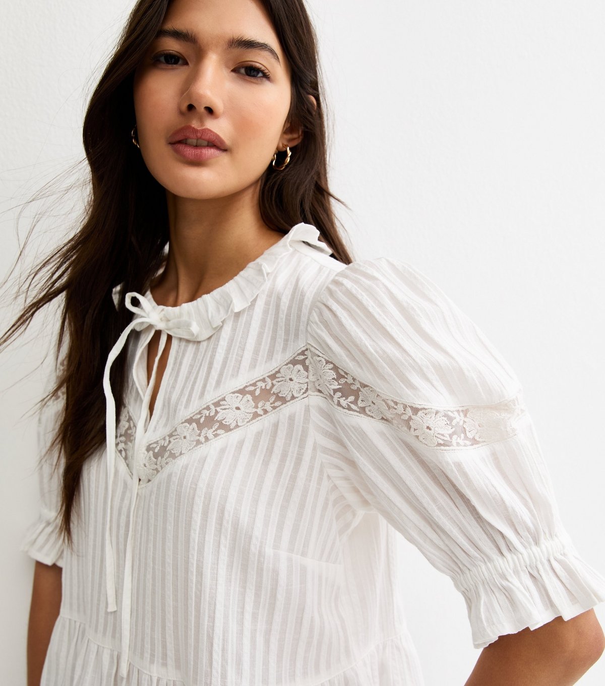 The New Look White Striped Ruffle Tie Neck Blouse is ideal for casual, daytime.