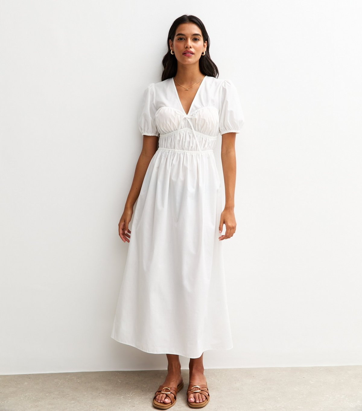 The New Look White V Neck Shirred Bodice Bow Front Midi Dress is available in sizes 10.