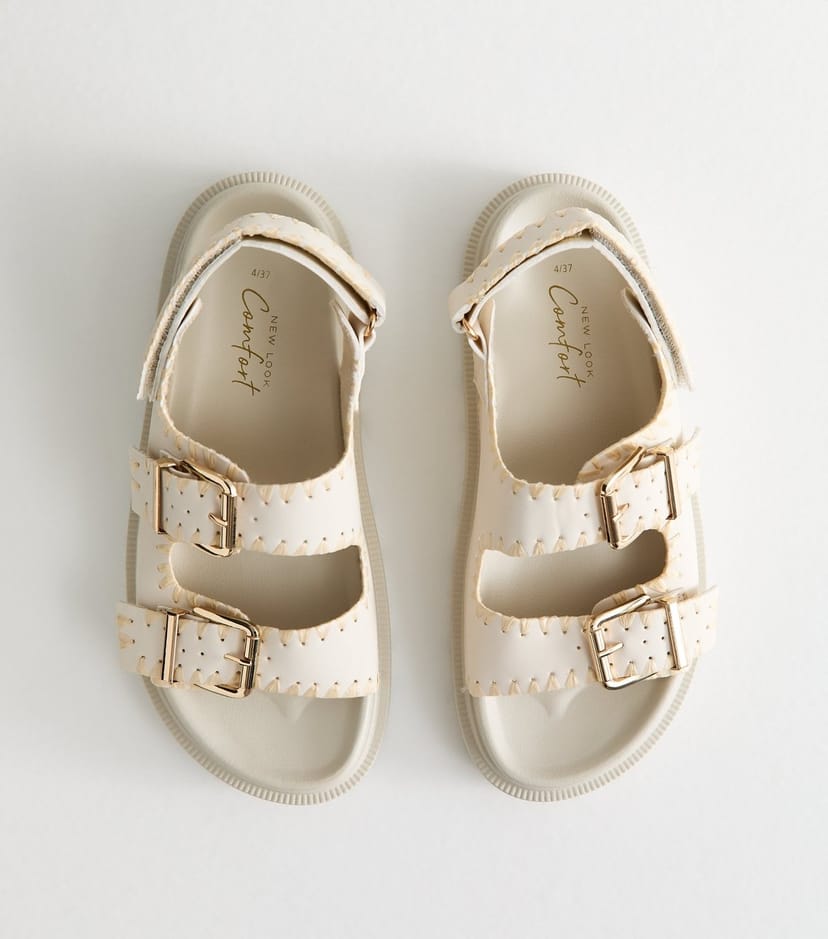 Chic white faux leather sandals with a chunky outsole and whipstitch trim. Features double straps with buckle fastenings and Comfort features. Perfect for a casual and stylish look.