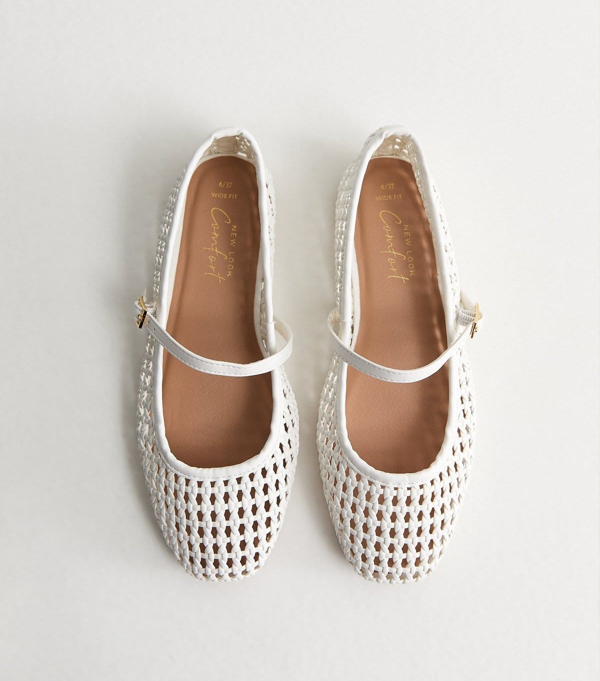 The New Look White Faux Leather Woven Mary Jane Pumps is available in sizes SIZE 3 - WIDE FIT, SIZE 4 - WIDE FIT, SIZE 5 - WIDE FIT, SIZE 6 - WIDE FIT, SIZE 7 - WIDE FIT, SIZE 8 - WIDE FIT.
