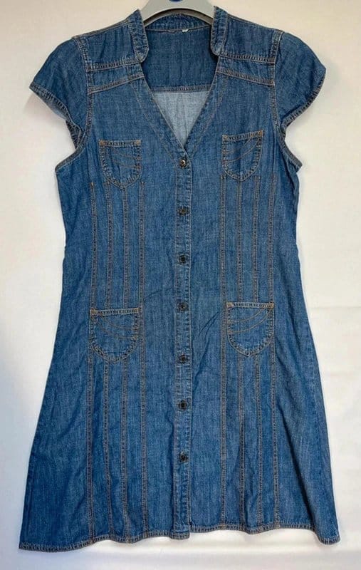 Stylish blue denim dress featuring a flattering V-neckline, cap sleeves, and full button-through front. Designed with contrast stitching and practical patch pockets for a classic denim look. Perfect for casual, everyday outfits and great layered with tights or a cardigan.