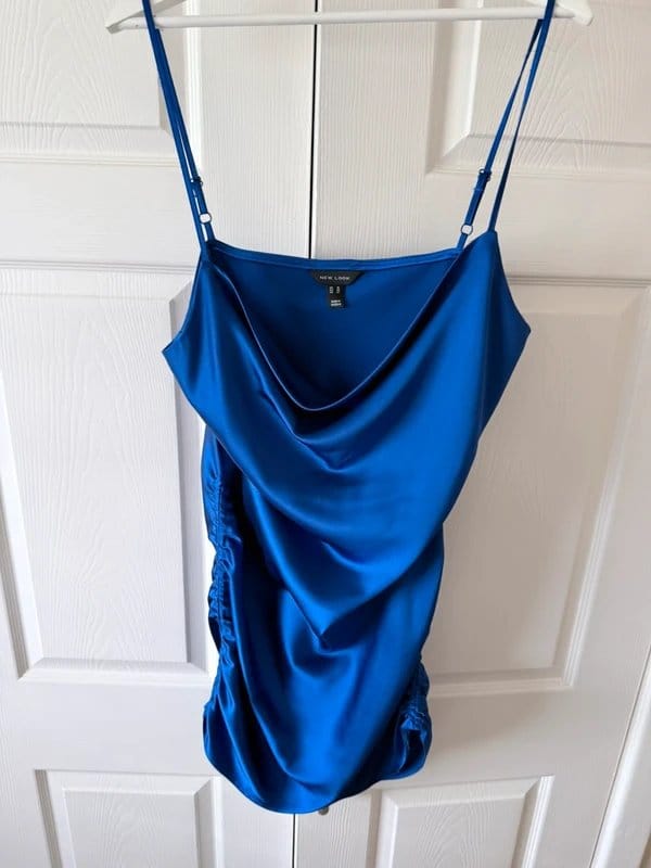 View Vinted's returns policyElegant blue satin slip dress from New Look. Features a strapless neckline and gathered detailing for a flattering fit. Perfect for evening events or special occasions.