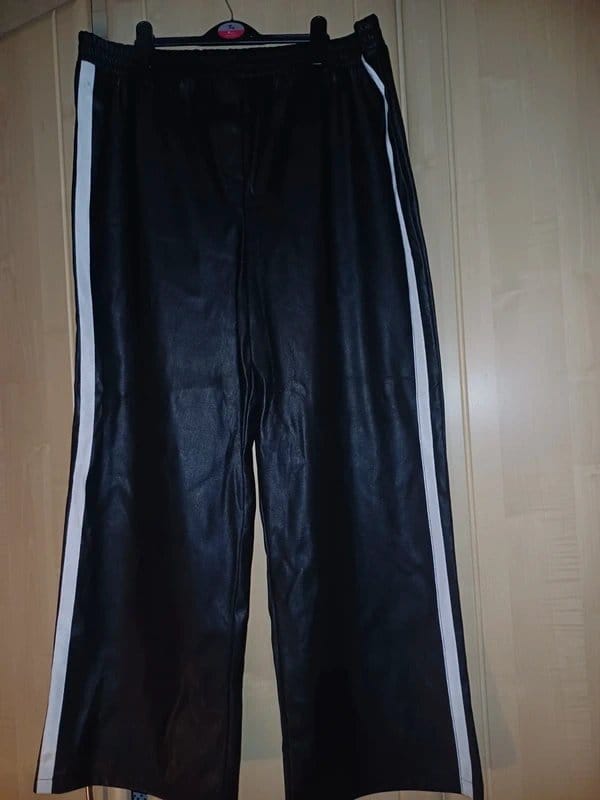 See all outfit ideasSleek black leather trousers with a modern fit and contrasting white side stripes. Perfect for a stylish and edgy look.