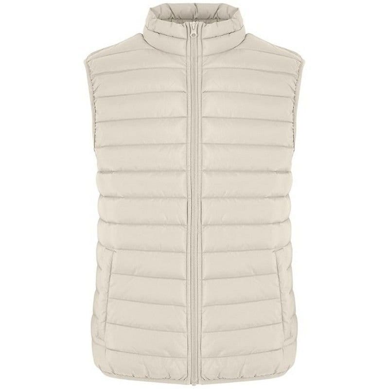 Lightweight puffer gilet in light sand polyester. Features a standing collar, full zip fastening, and two side pockets. Ideal for layering over casual outfits.