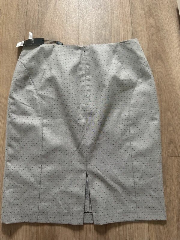 This grey work skirt features a polka-dot pattern for a stylish and professional look. The straight cut and mid-length design makes it perfect for formal occasions or office wear.