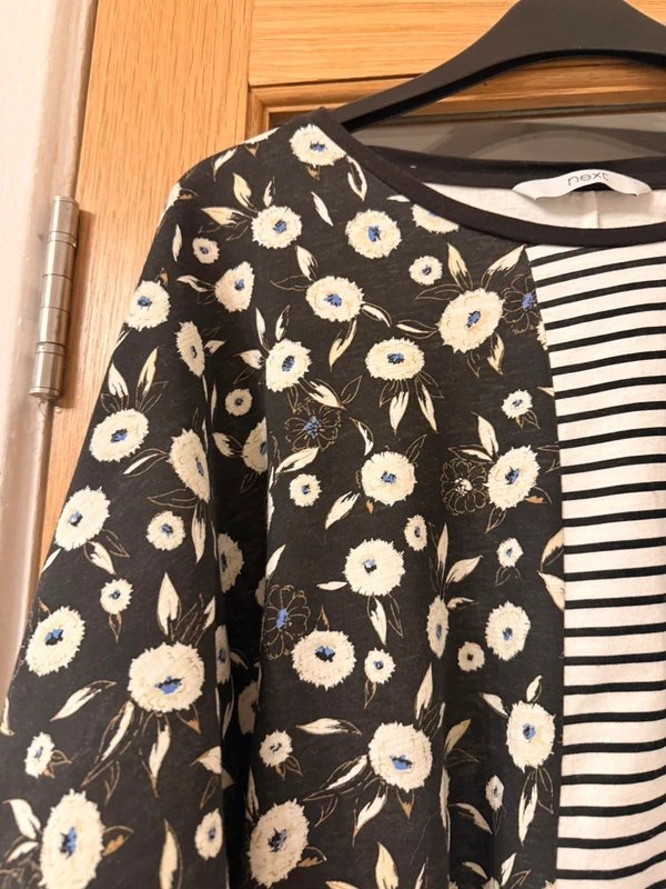 Gorgeous multi print t-shirt from Next. Stripes with the contrast of vintage floral print. Elasticated cuffs on the sleeves.