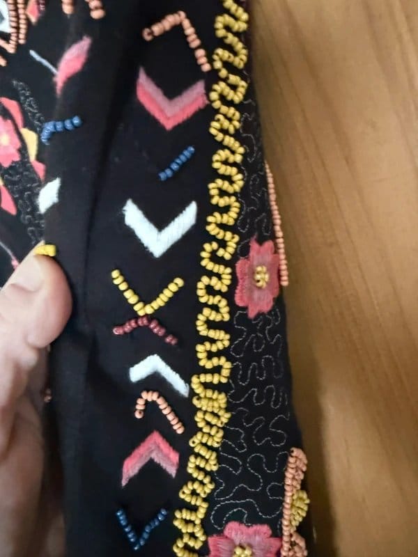 This black embellished mini skirt from Next, size 12, features intricate beadwork, embroidery, and mirror detailing in pink, yellow, blue, and white. It's perfect for holidays, festivals, or a statement evening look.