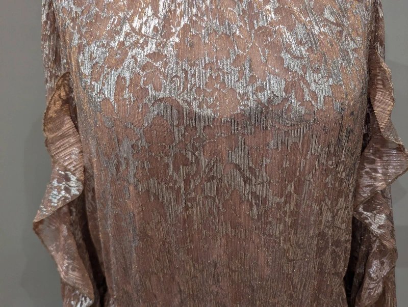A stunning gold metallic chiffon dress from Next, featuring frilled edges on the sleeves and skirt. The dress has an elegant half open back and a button at the rear neckline. Perfect for evening occasions.