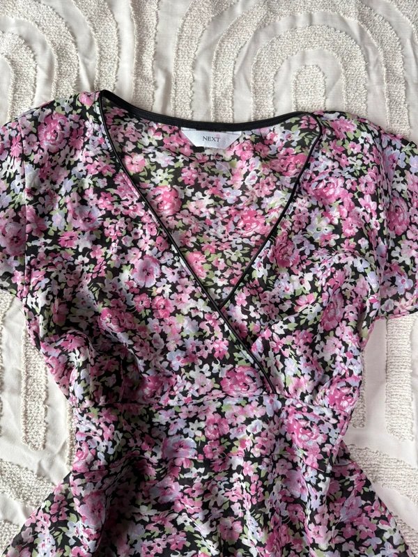 The Next Floral Wrap V Neck Floaty Blouse Top in Pink is available in sizes M.