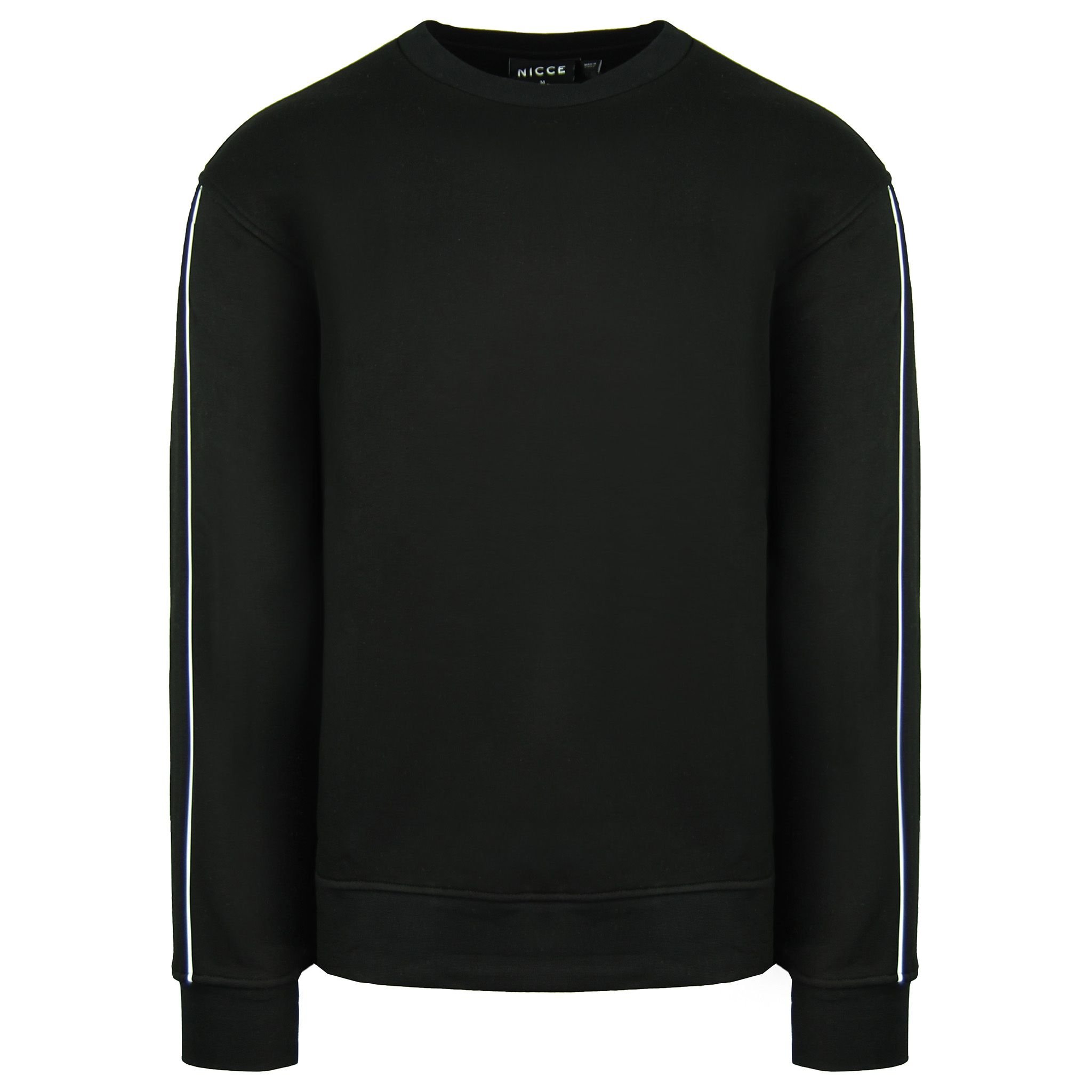 Stylish black crew neck sweatshirt by Nicce. Made from soft cotton for comfort, featuring contrasting white stripes on the sleeves for a modern touch. Ideal for casual wear or layering.