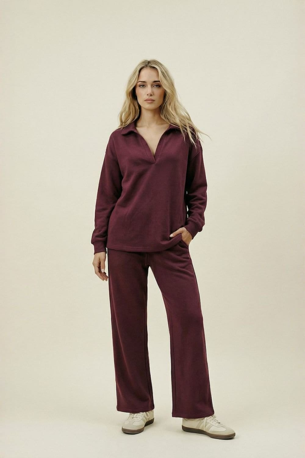 Luxurious loungewear set in burgundy featuring a long-sleeve top and wide-leg trousers. Crafted from soft fabric for ultimate comfort, perfect for both dressing up or down.